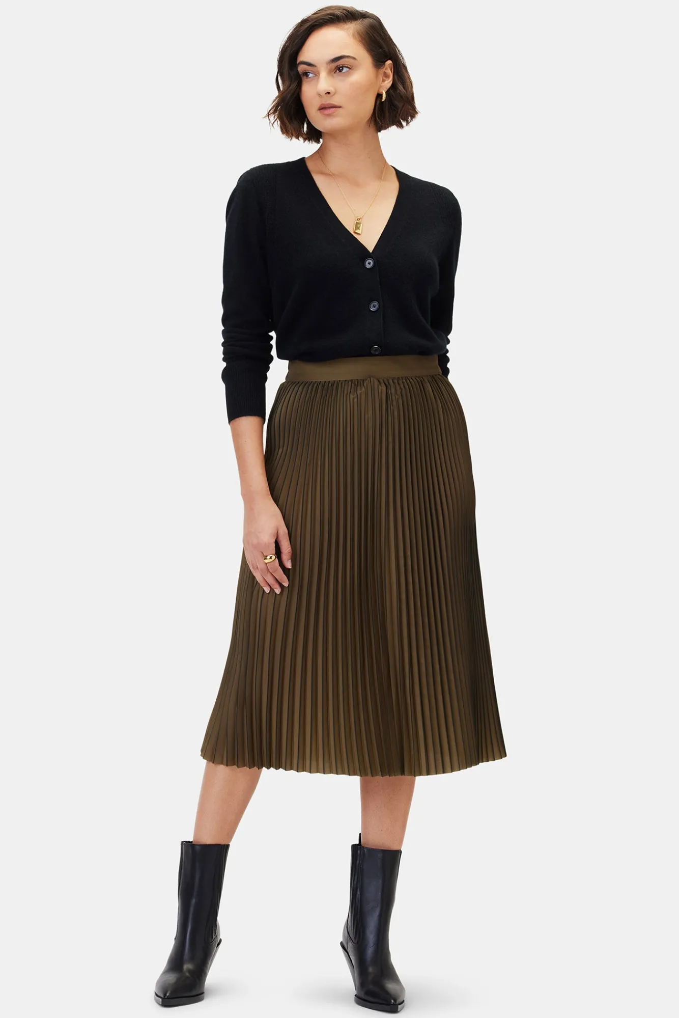 Dry Clean OnlyMidi length A-line skirt with pleated detail.Made from 100% Recycled Polyester.Featuring an elastic waistb…