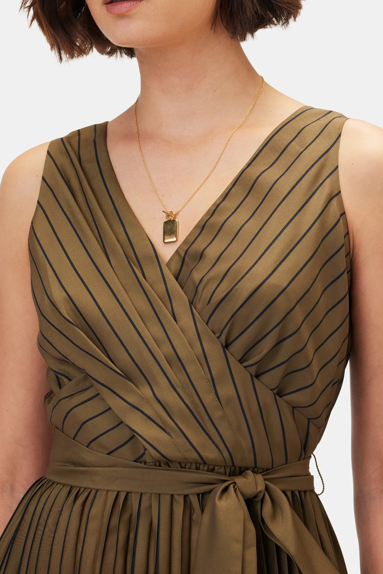 - Midi length A-line sleeveless dress with a twist surplice bodice, pleated skirt, waist tie detail, and zipper.