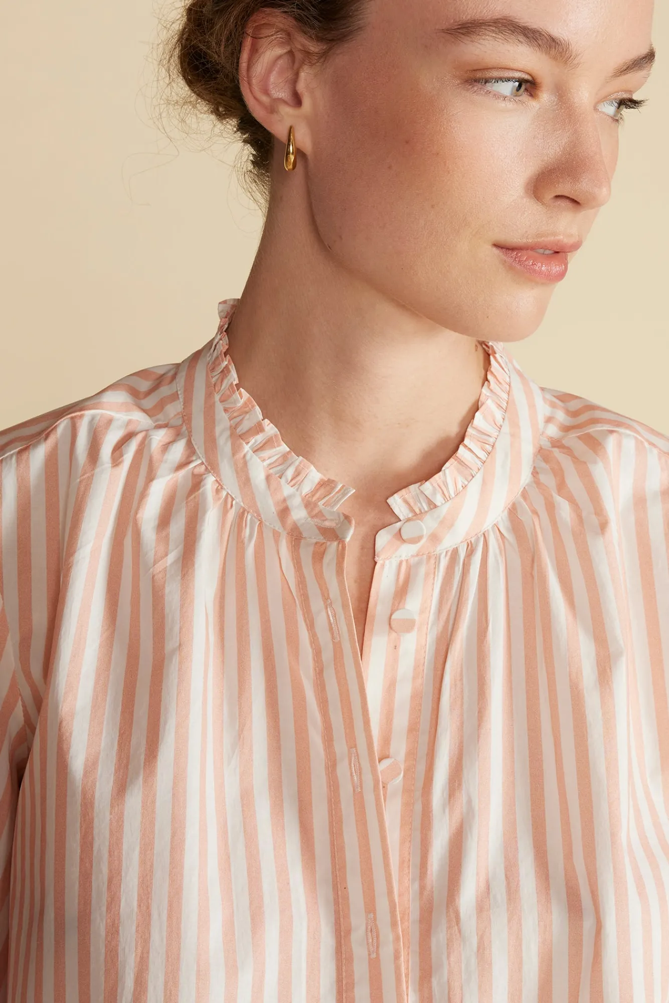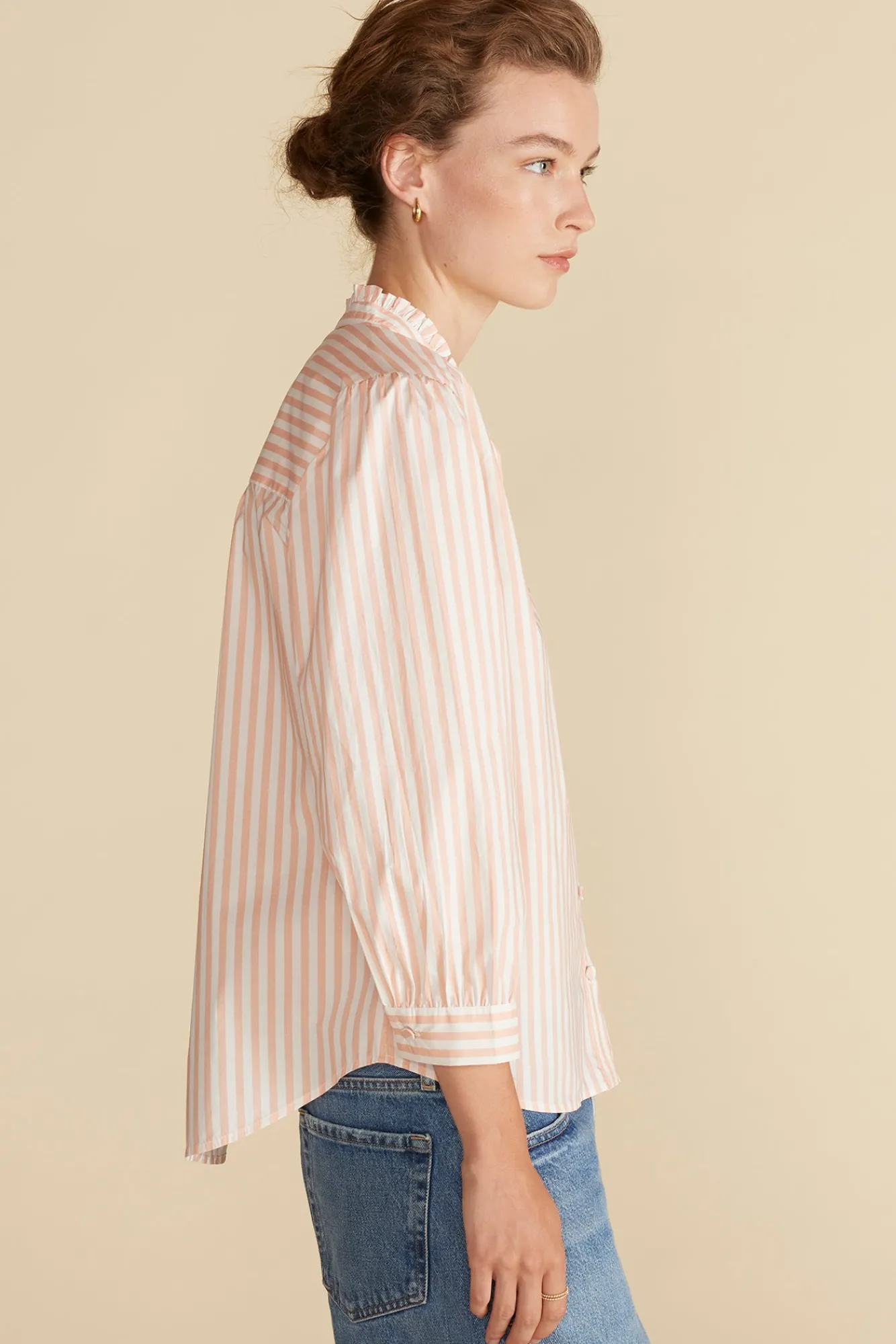 Machine WashableOrganicAn airy band collar shirt with a curved hem and delicate ruffle detailing. Relaxed yet crisp in o…