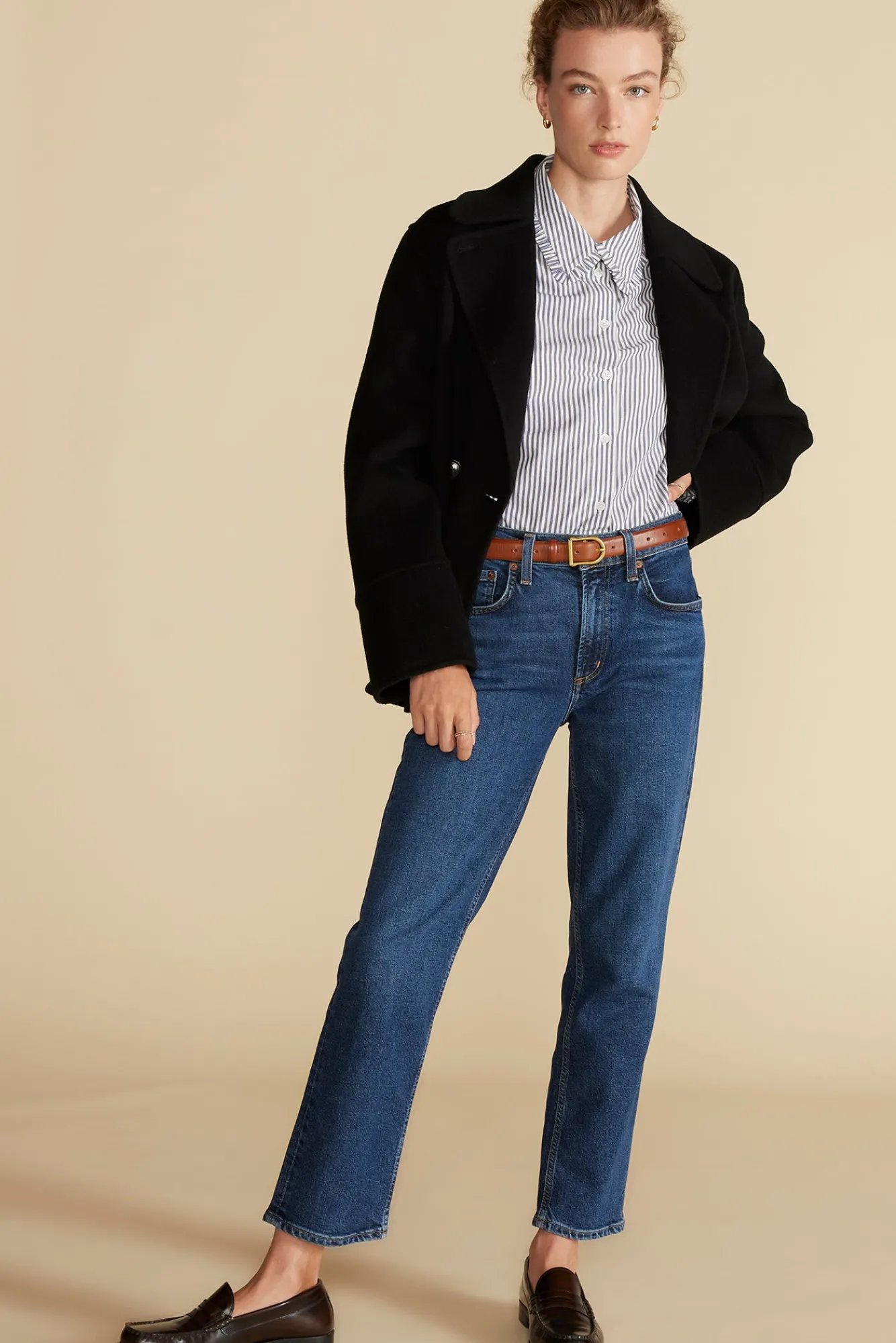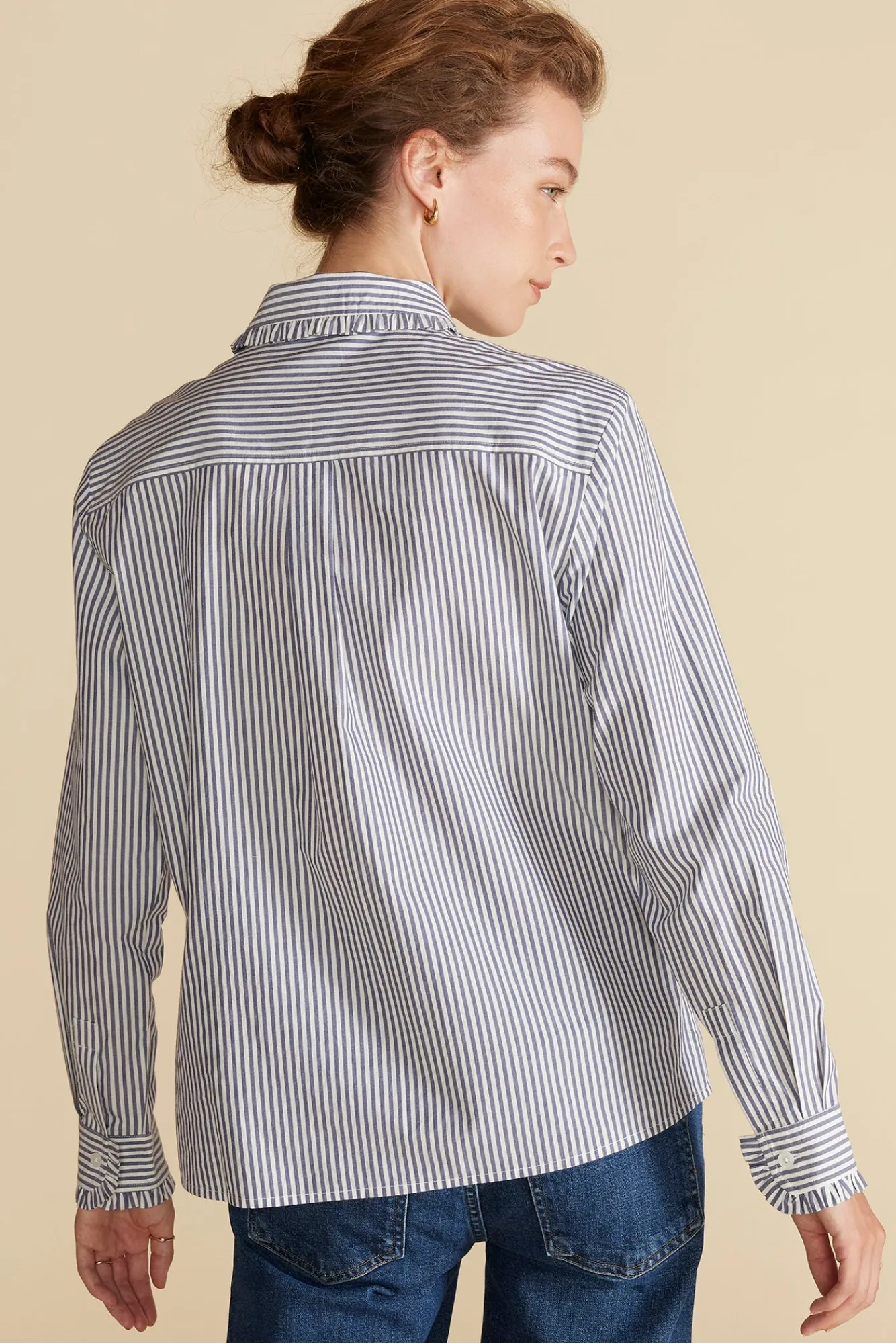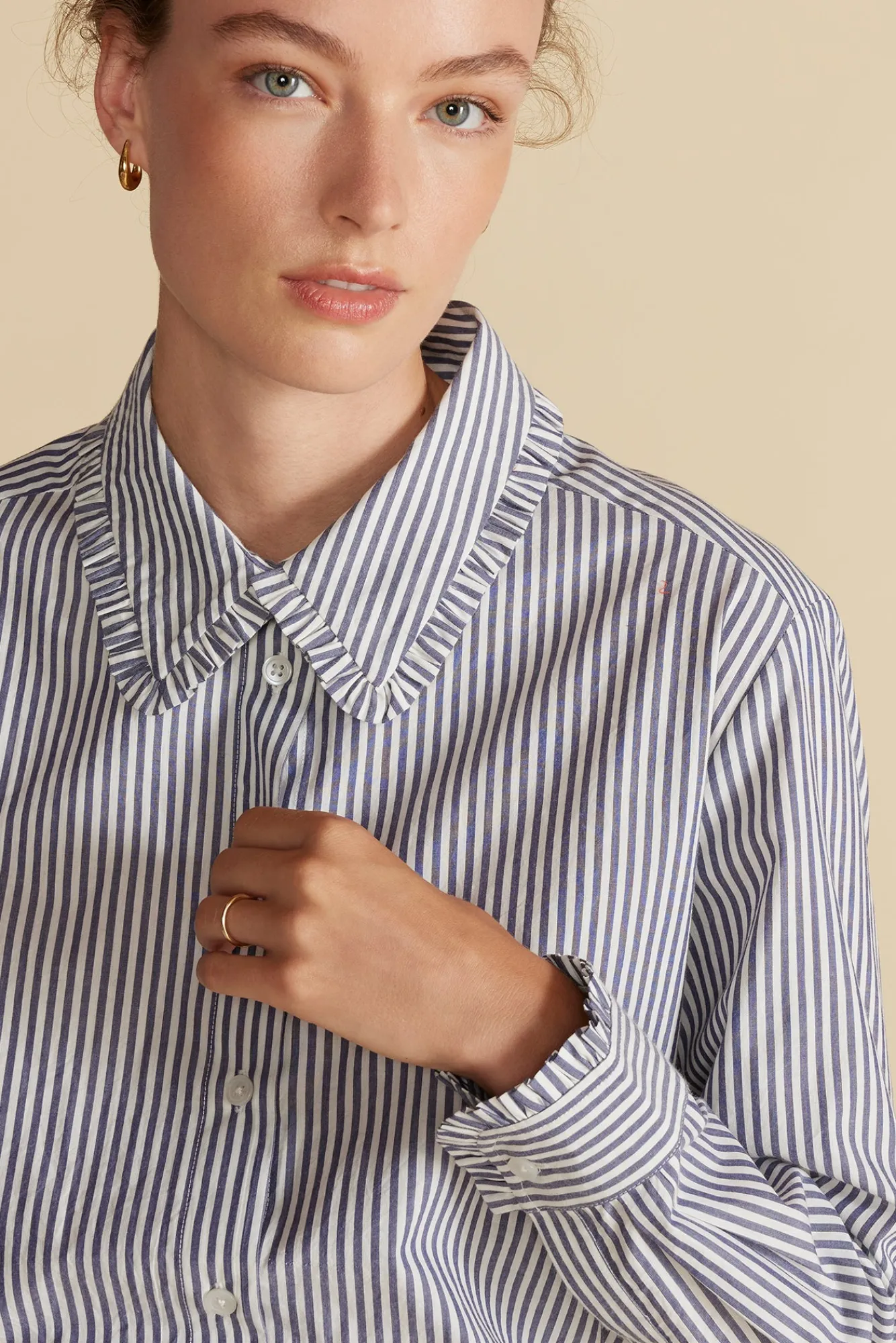 Machine WashableOrganicThe crisp cotton poplin shirt is reinvented with ruffled edges at the collar and a vertical strip…