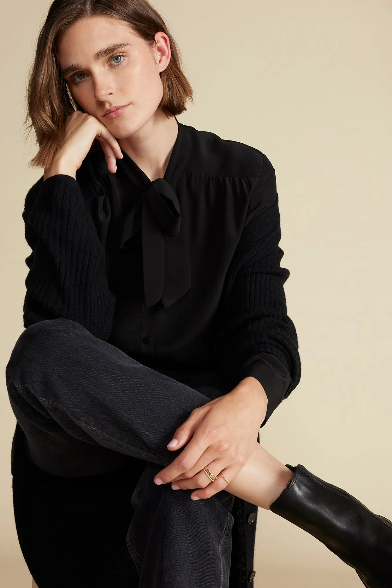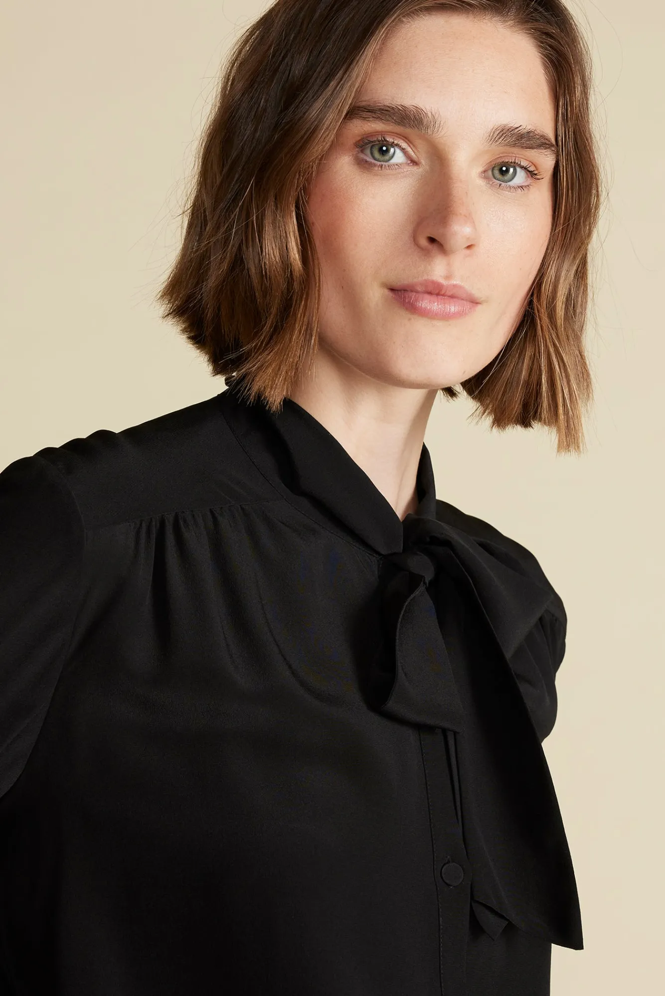 Machine WashableMake an impression with this washable silk bow blouse. The long ties at the neck and subtle puffed sleev…