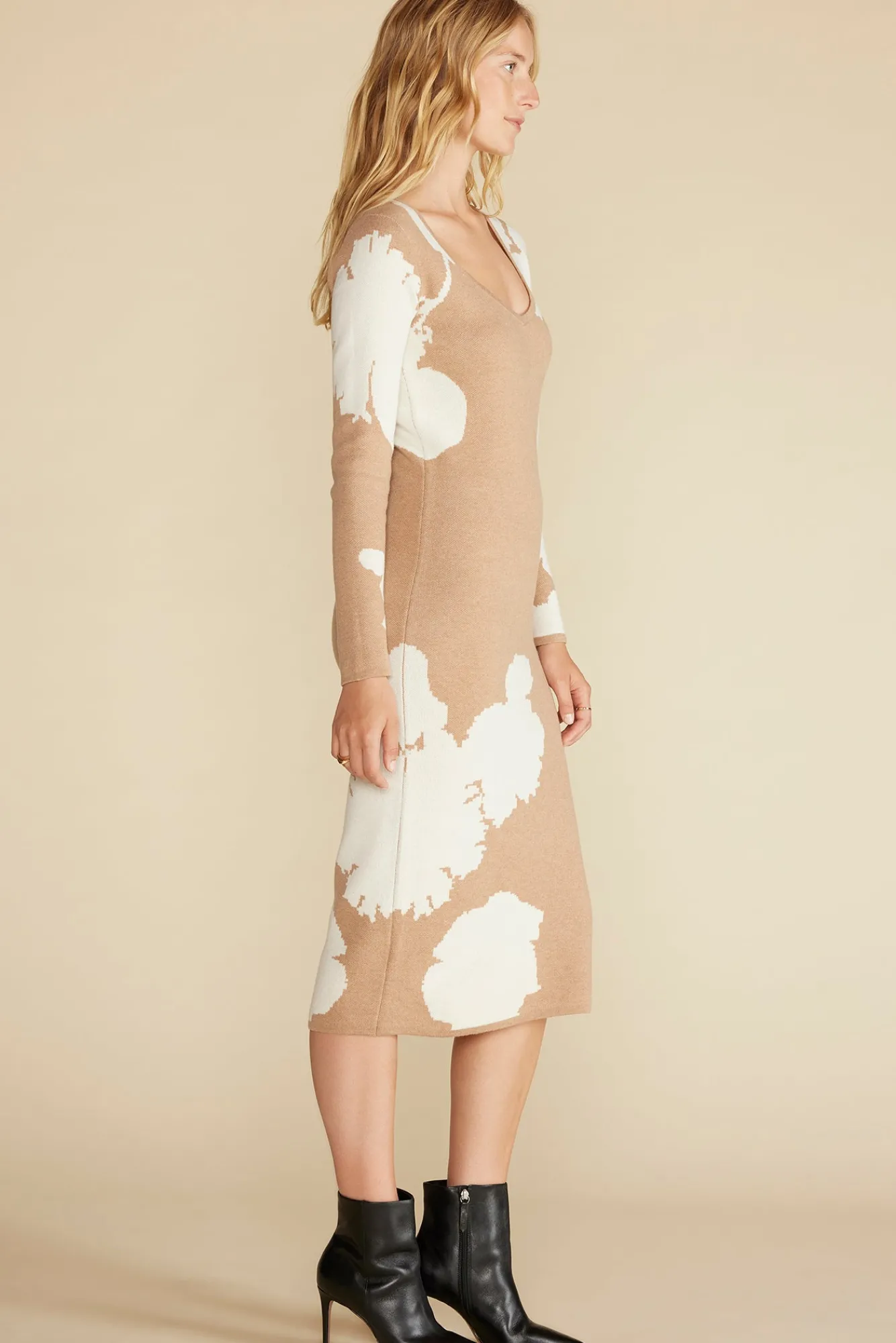 – A midi-length sweater dress with long sleeves and a square neckline. Raised abstract floral motif is intricately woven on a jacquard loom using a mid-weight yarn.