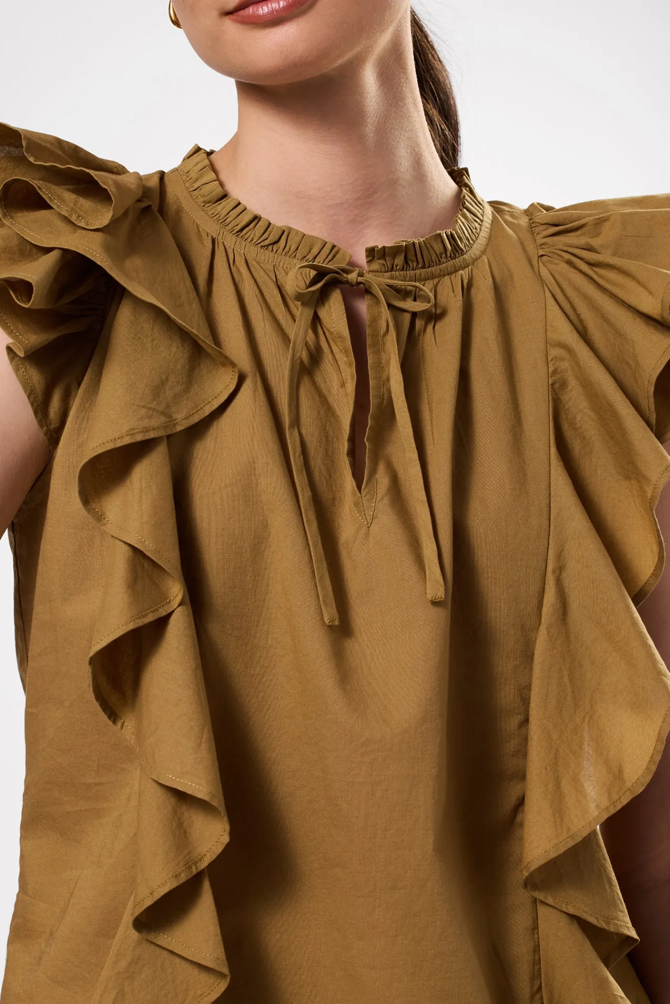 A ruffled sleeve adds a Parisian charm to this quintessential summer blouse. Light and airy in organic cotton cambric.