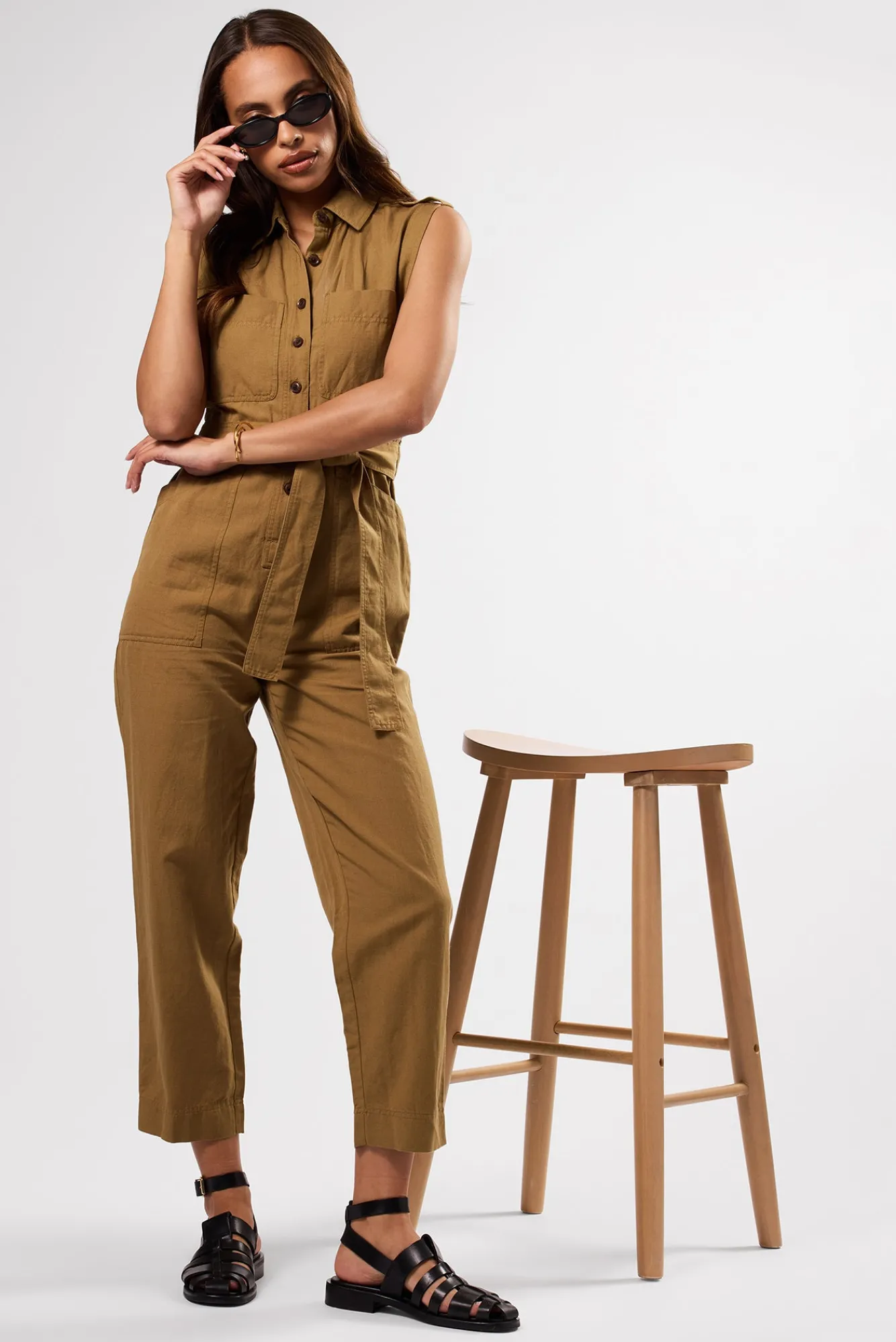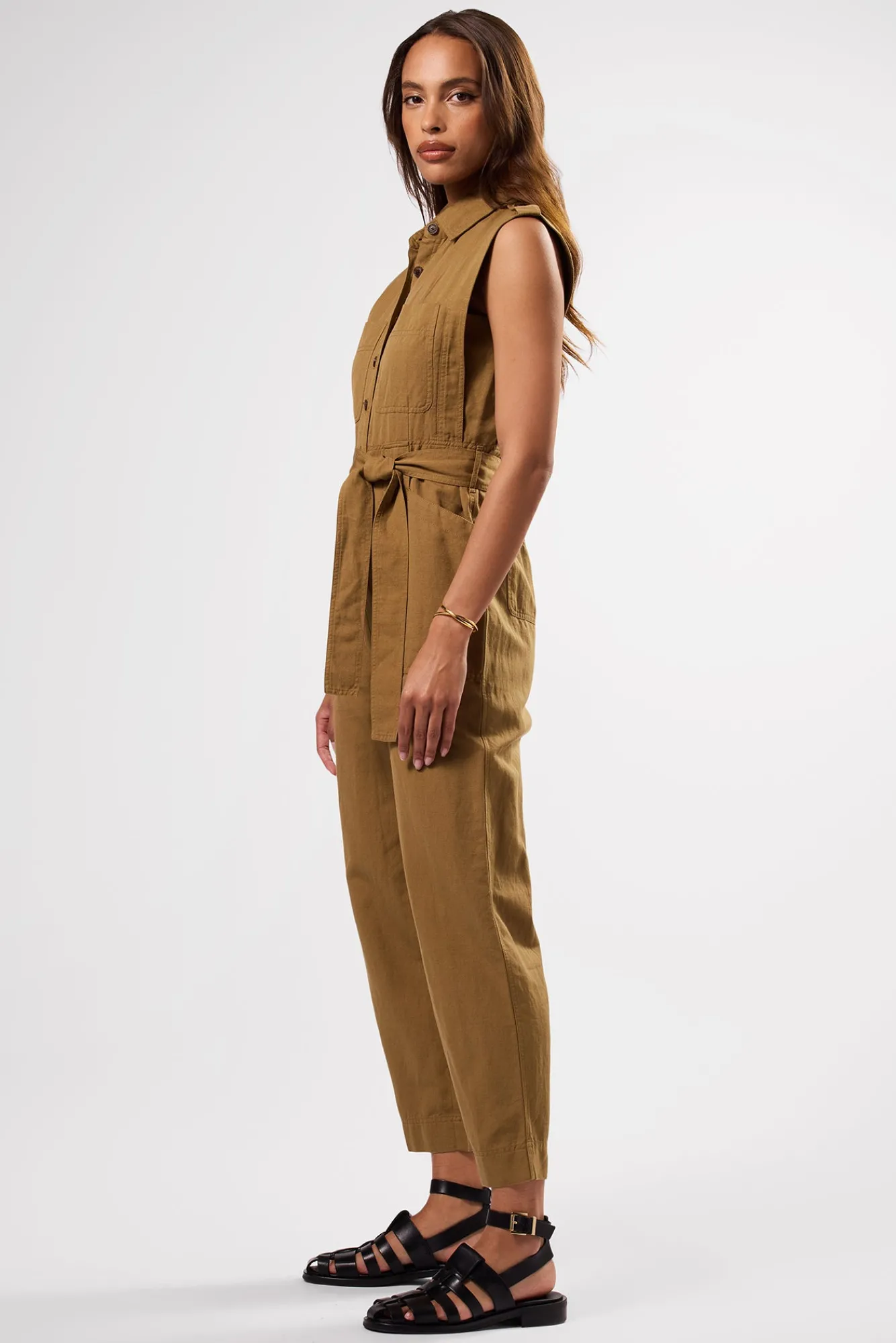 - Slim-fitting, sleeveless jumpsuit with inset shoulder detailing and front placket