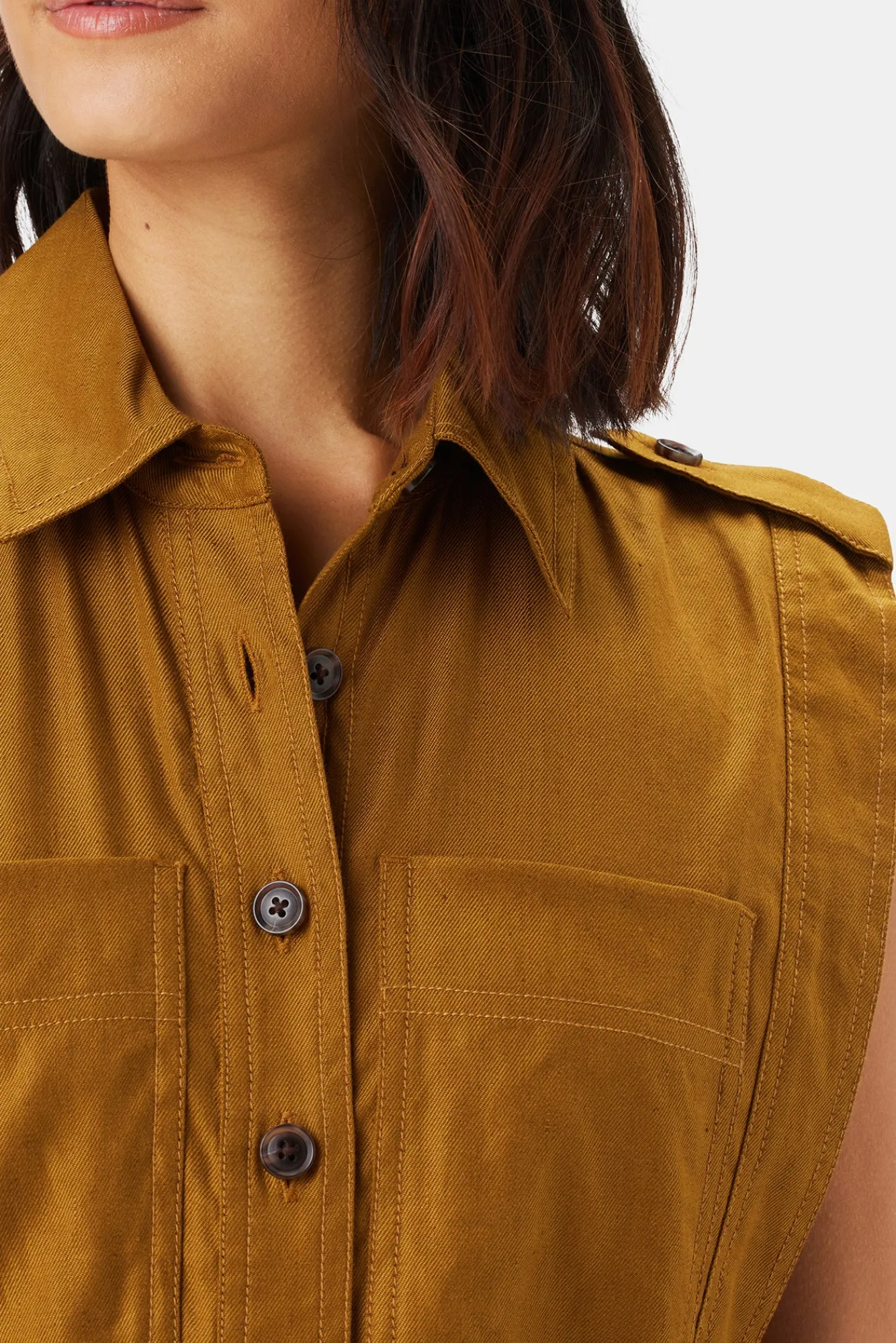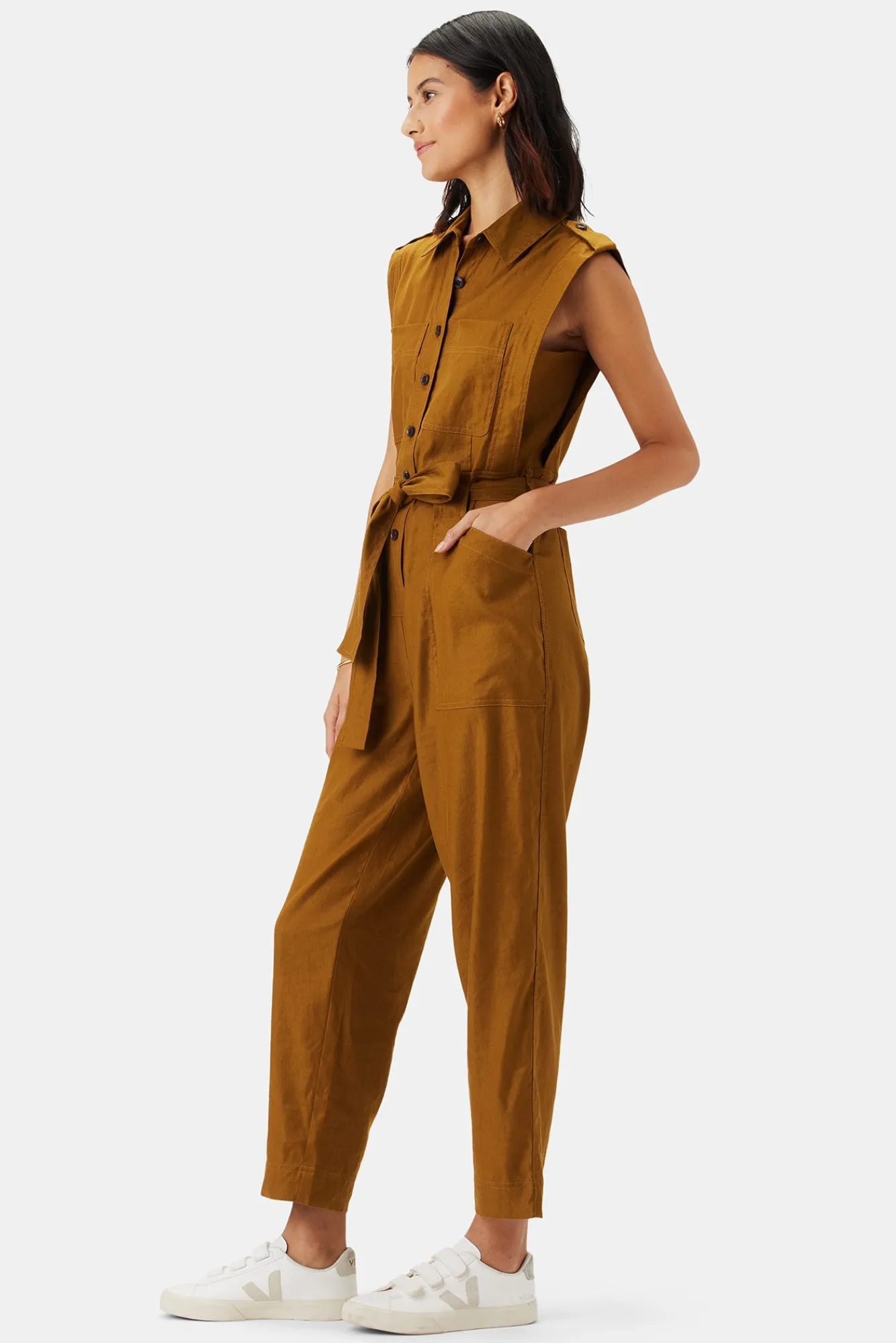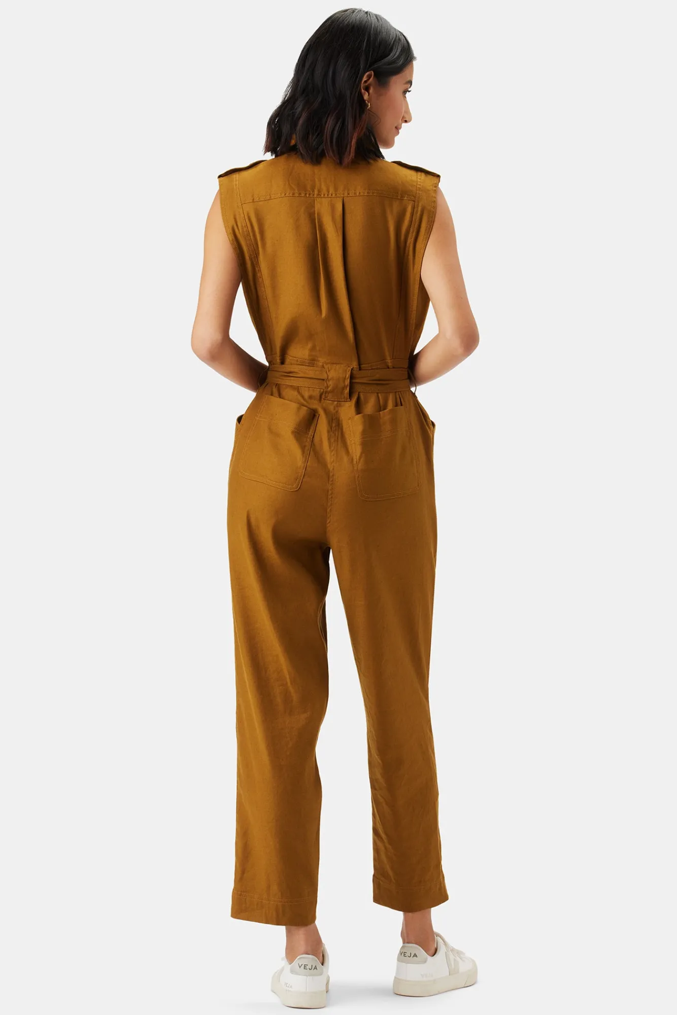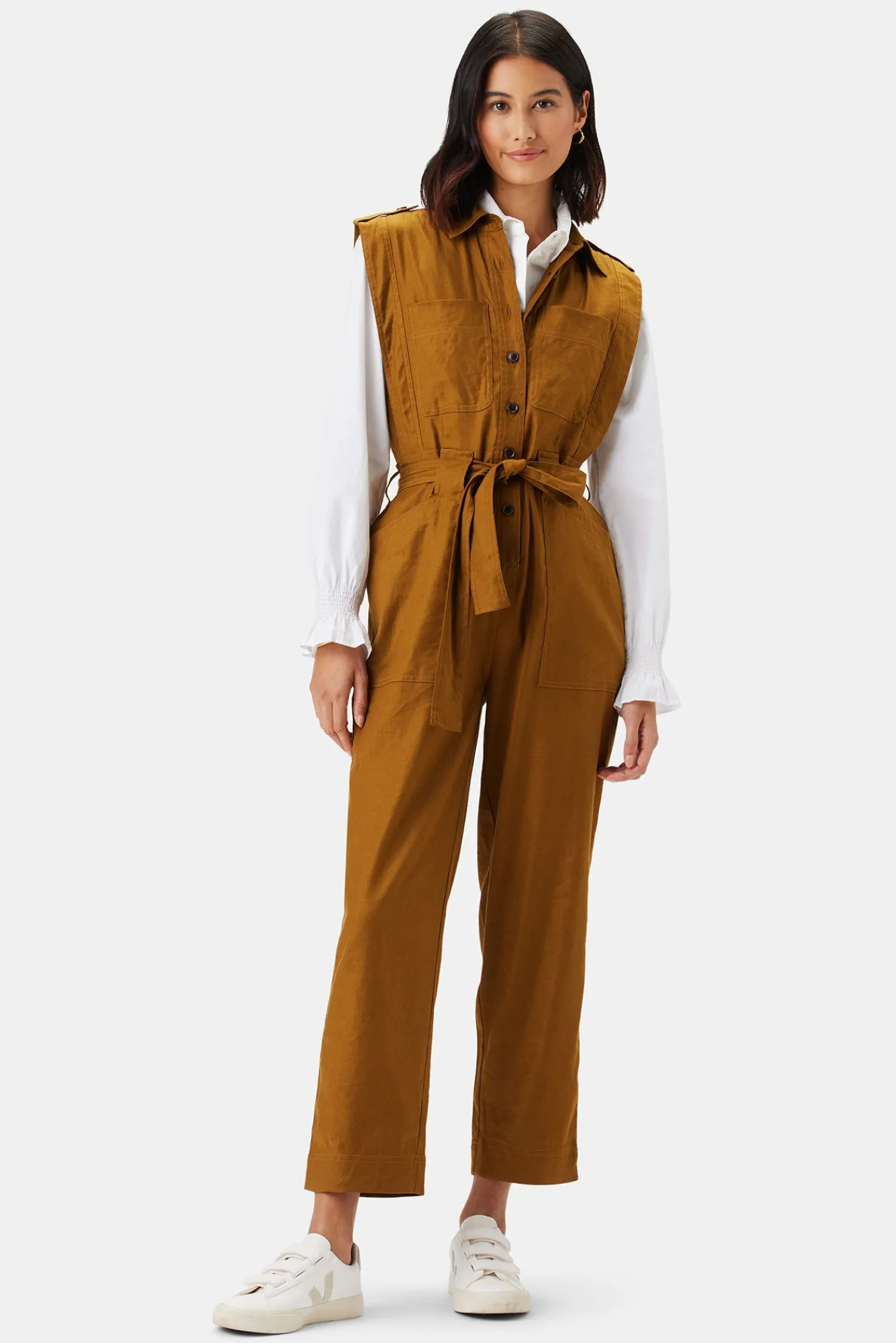 - Slim-fitting, sleeveless jumpsuit with inset shoulder detailing and front placket